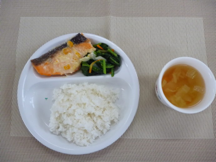 今日の給食は、「鮭のコーンマヨネーズ焼き」、「ほうれん草のソテー」と「野菜のスープ」