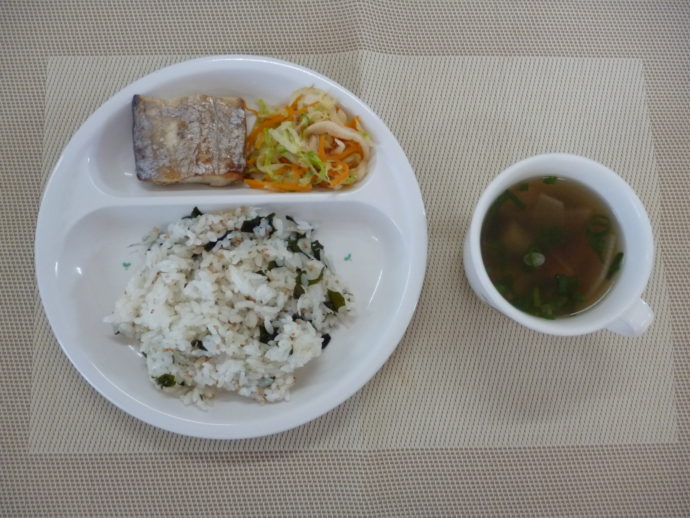 今日の給食は、「わかめごはん」、「太刀魚の塩焼き」、「キャベツのおかか和え」と「けんちん汁」