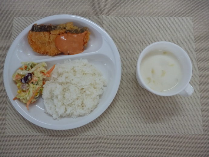 今日の給食は、「サーモンフライ」、「ひよこ豆のサラダ」と「クリームスープ」 おやつは、「牛乳」、「マシュマロサンド」と「こんぶ」です。