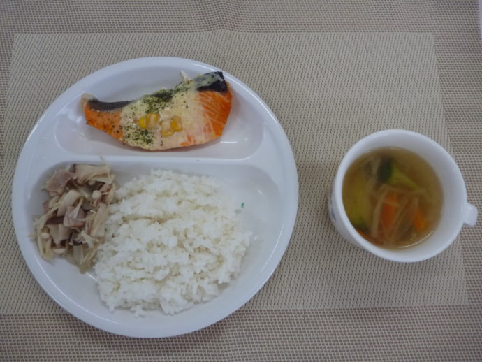 今日の給食は、「鮭のコーンマヨ焼き」、「きのことベーコンのソテー」と「コンソメスープ」 おやつは、「牛乳」、「マカロニきなこ」と「ビスコ」です。