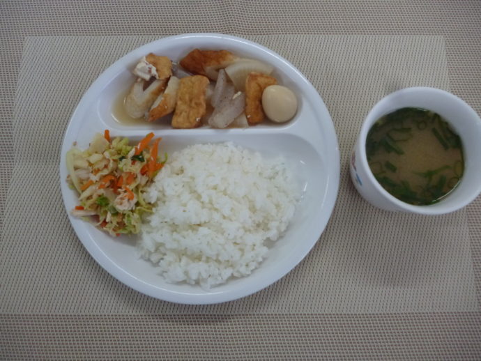 今日の給食は、「おでん」、「キャベツと鶏ささみのごま和え」と「玉ねぎのみそ汁」 おやつは、「牛乳」、「オレンジ」と「新潟仕込み」です。