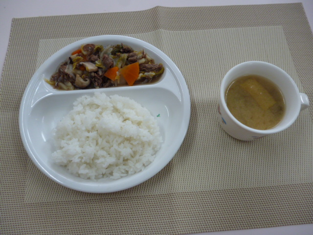 今日の給食は、「すき焼き煮」と「豆腐のみそ汁」 おやつは、「牛乳」と「お楽しみおやつ」です。