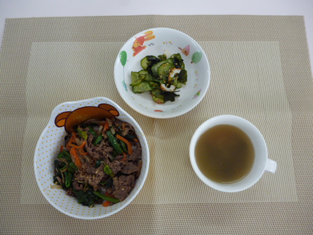 今日の給食は、「ビビンバ」、「きゅうりの酢の物」と「はるさめのスープ」 おやつは、「牛乳」と「きなこクリームサンド」です。
