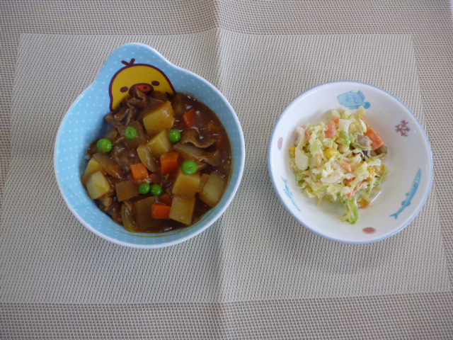 今日の給食は、「カレーライス」と「ひよこ豆のサラダ」