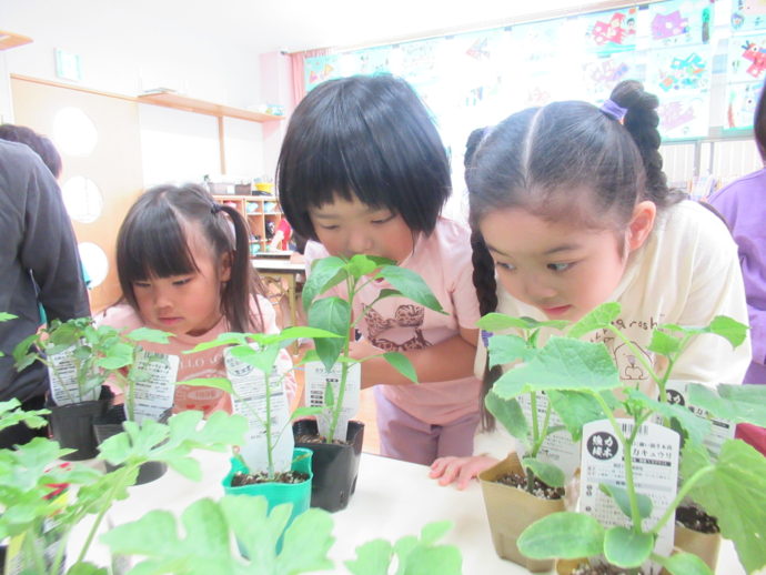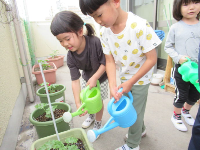 それぞれが育てます。また5歳児さんが中心になって、「きゅうり」「ピーマン」「ミニトマト」