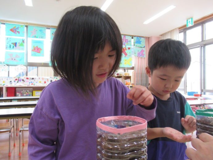 大きい組さんは、野菜の苗を植えました!4歳児さんは、ペットボトルで「人参」を
