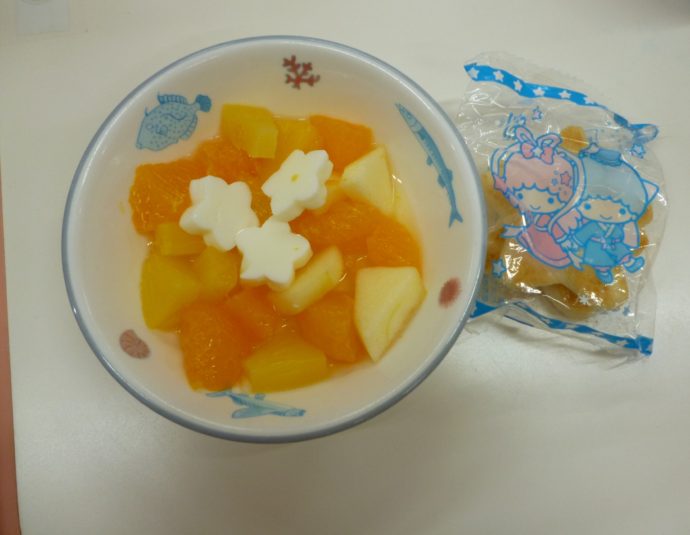 そして、今日のおやつの「フルーツポンチ」は給食の先生・栄養士さんで