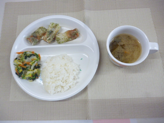 今日の給食は「ごはん」「ちくわの磯辺揚げ」「白菜のお浸し」「玉葱の味噌汁」です。