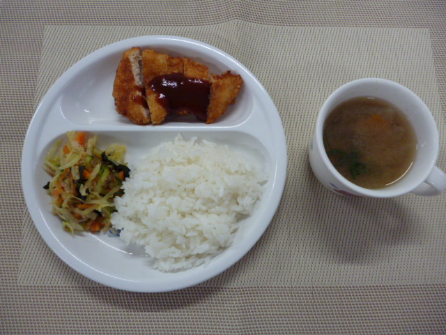 今日の給食は、「チキンカツ」、「キャベツの和風サラダ」と「根菜のみそ汁」