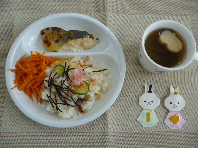 今日の給食は、「ちらし寿司」、「さわらの西京焼き」、「にんじんのごま炒め」と