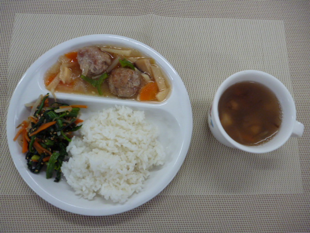 今日の給食は、「肉団子の酢豚風」、「ほうれん草のナムル」と「もずくスープ」 おやつは、「牛乳」、「バナナ」と「うす焼き サラダ」です。