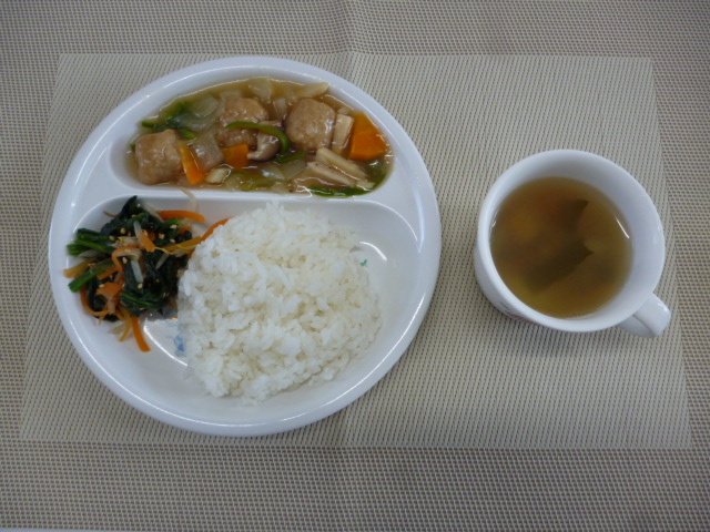 今日の給食は、「肉団子の酢豚風」、「ほうれん草のナムル」と「豆腐とわかめのスープ」