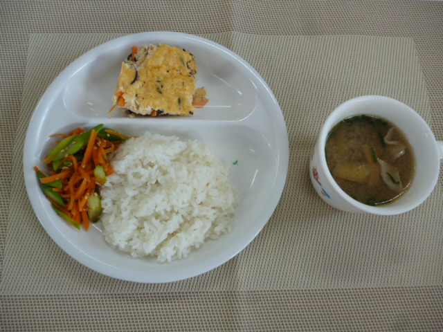 今日の給食は、「擬製豆腐」、「アスパラのごま和え」と「豚汁」 おやつは、「牛乳」、「りんご」と「ぽたぽた焼き」です。