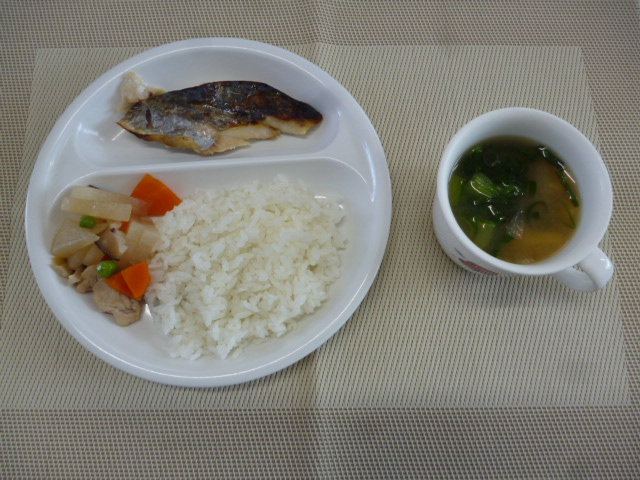今日の給食は、「さわらの塩焼き」、「大根と鶏肉の煮物」と「小松菜のみそ汁」