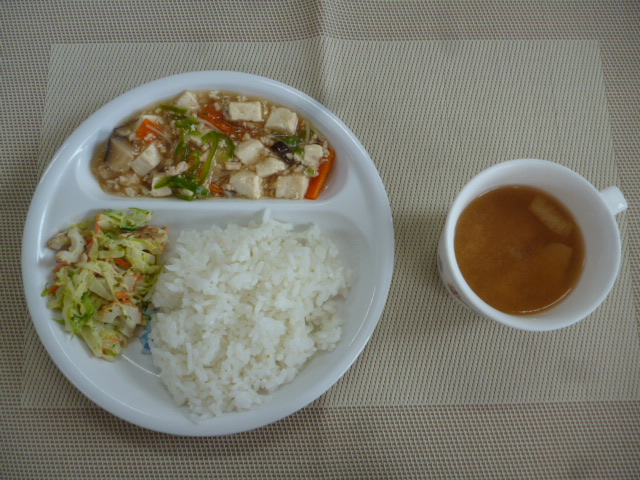 令和3年5月18日(火)の献立 2021/05/18 今日の給食は、「豆腐のきのこあんかけ」、「キャベツののりマヨネーズ和え」と「かぼちゃのみそ汁」 おやつは、「牛乳」、「みたらし団子」と「ぽりぽり小魚」です。