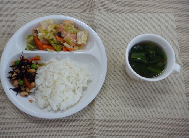 今日の給食は、「鮭のちゃんちゃん焼き」、「大豆とひじきの炒め煮」と「小松菜のすまし汁」