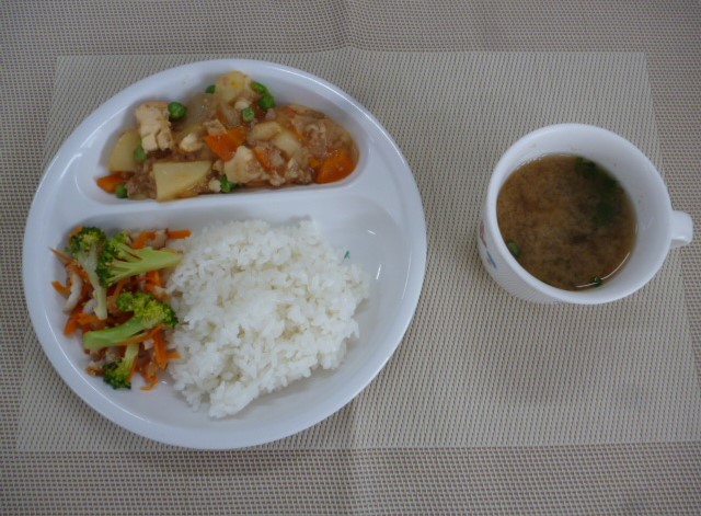 今日の給食は、「厚揚げとじゃが芋のそぼろ煮」、「ブロッコリーのごま酢和え」と「なすのみそ汁」