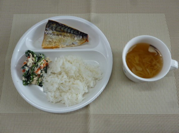今日の給食は、「さばの塩焼き」、「白和え」と「キャベツのすまし汁」