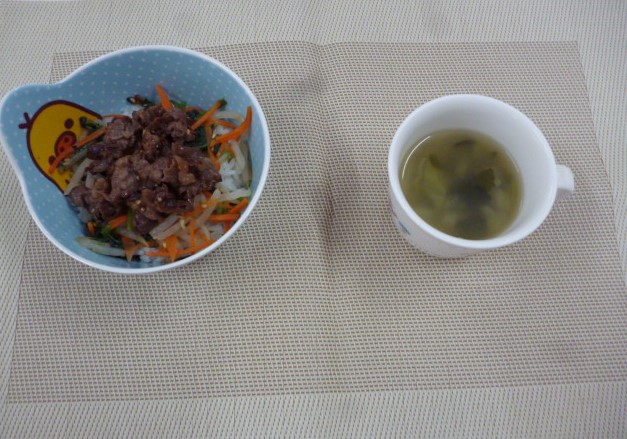 今日の給食は、「ビビンバ」と「中華スープ」 おやつは、「牛乳」と「お楽しみおやつ」です。