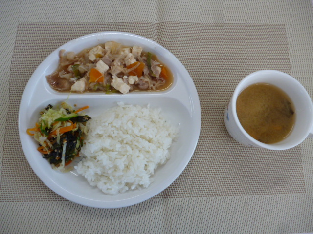 今日の給食は、「肉豆腐」、「キャベツのナムル」と「玉ねぎのみそ汁」 おやつは、「牛乳」と「コーンマヨトースト」です。