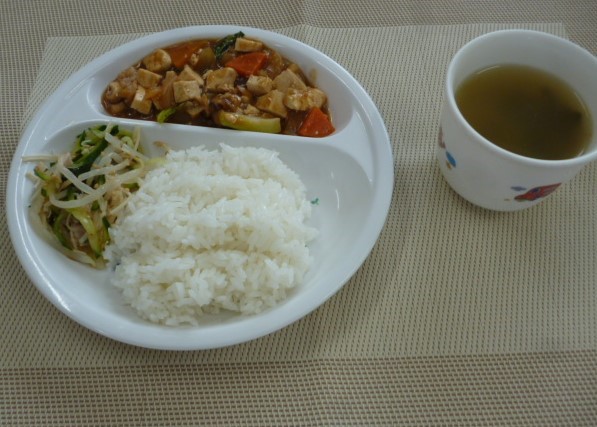 今日の給食は、「豚肉と豆腐の味噌炒め」、「もやしときのこの中華和え」と「わかめスープ」