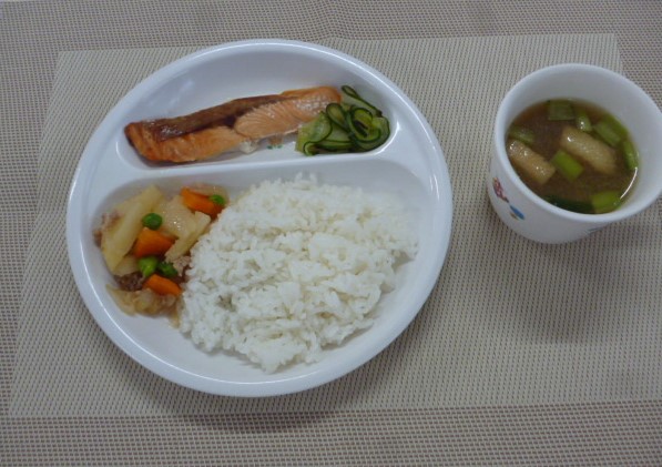 令和3年6月16日(水)の献立 2021/06/16 今日の給食は、「鮭の塩焼き」、「じゃが芋とひき肉の煮物」と「小松菜のみそ汁」 おやつは、「牛乳」と「にんじん蒸しパン」と「チーズ」です。 今日はひかり組さんが育てたきゅうりをみんなで食べました🥒