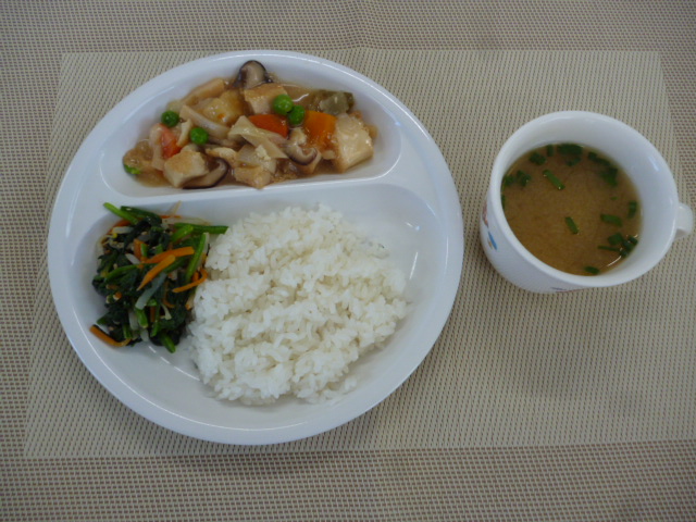 今日の給食は、「厚揚げの甘酢あんかけ」、「ほうれん草のごま和え」と「えのきのみそ汁」 おやつは、「牛乳」、「マシュマロサンド」と「こんぶ」です。