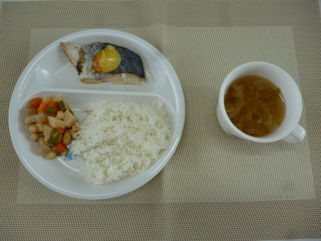 今日の給食は、「さわらのみそマヨネーズ焼き」、「五目煮豆」と「切干大根のすまし汁」 おやつは、「牛乳」、「きなこ団子」と「ぽりぽり小魚」です。