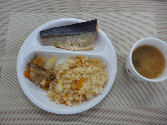 令和3年7月6日(火)の献立 2021/07/06 今日の給食は、「油揚げとにんじんの混ぜごはん」、「さばの塩焼き」、「じゃが芋きんぴら」と 「小松菜のみそ汁」 おやつは、「牛乳」、「マカロニきなこ」と「うす焼き サラダ」です。