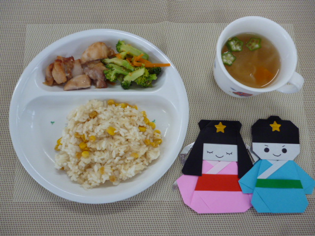 今日の給食は、「焼きもろこしごはん」、「鶏肉の照り焼き」、「ブロッコリーのごま和え」と