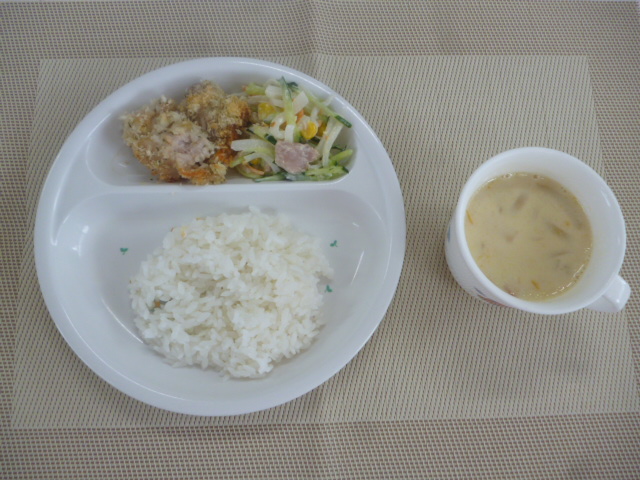 今日の給食は、「鶏肉のパン粉焼き」、「大根とツナのサラダ」と「豆乳スープ」