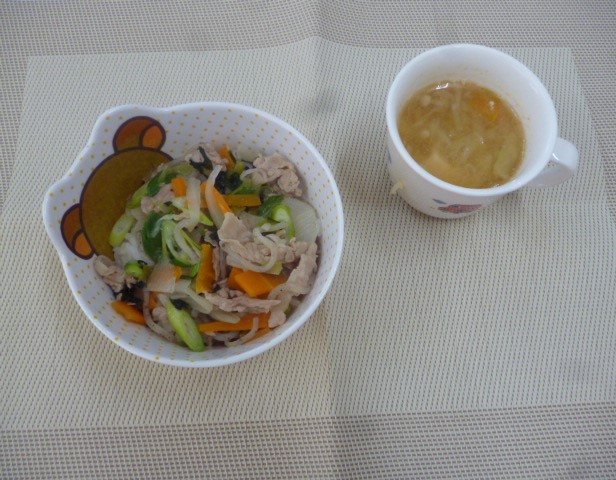 今日の給食は、「豚丼」と「厚揚げのみそ汁」 おやつは、「牛乳」と「お楽しみおやつ」です。