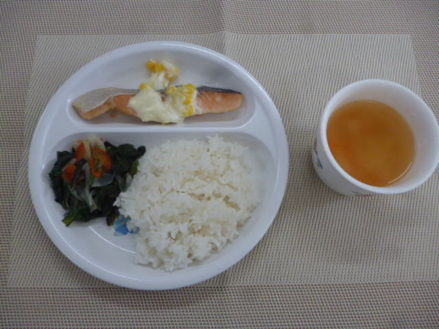 令和3年7月30日(金)の献立 2021/07/30 今日の給食は、「鮭のコーンマヨネーズ焼き」、「ほうれん草とベーコンのソテー」と「コンソメスープ」 おやつは、「牛乳」、「バナナ」と「じゃこ揚げせん」です。 園庭と事務室側で育てている「ゴーヤ」の第二弾!収穫となりました! 事務所側のゴーヤは黄色くなりすぎていましたが、園庭のゴーヤはたくさん収穫できました✨