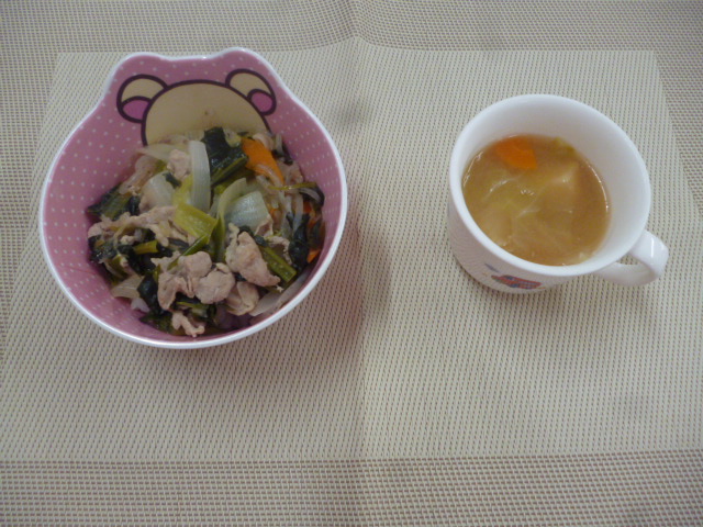 今日の給食は、「豚丼」と「厚揚げのみそ汁」 おやつは、「牛乳」と「お楽しみおやつ」です。