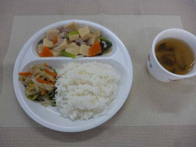 今日の給食は、「高野豆腐の中華風炒め煮」、「もやしとわかめのナムル」と「玉ねぎのすまし汁」