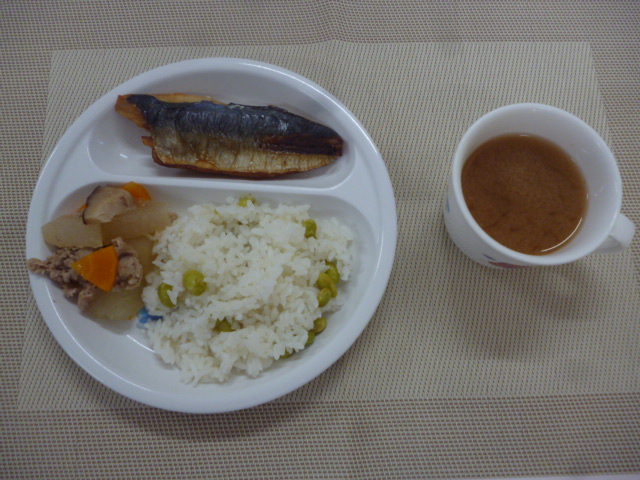今日の給食は、「えだまめごはん」、「あじの塩焼き」、「冬瓜と豚肉の煮物」と「なすのみそ汁」