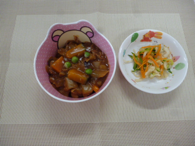 今日の給食は、「夏野菜カレー」と「切干大根のサラダ」 おやつは、「牛乳」、「バナナ」と「白い風船」です。
