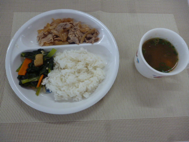 今日の給食は、「豚肉のしょうが焼き」、「小松菜とあげの煮浸し」と「かぼちゃのみそ汁」 おやつは、「牛乳」、「いももち」と「ぽりぽり小魚」です。