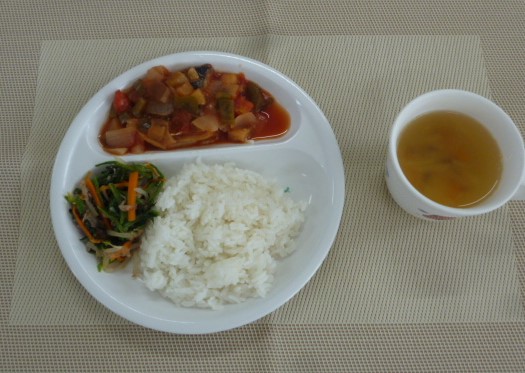 今日の給食は、「さばのトマトソースがけ」、「ほうれん草のおかか和え」と「オニオンスープ」