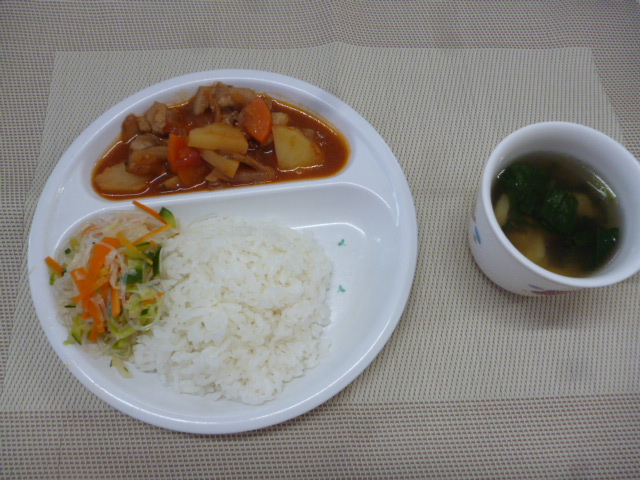 令和3年9月6日(月)の献立 2021/09/06 今日の給食は、「鶏肉と根菜のトマト味噌煮込み」、「伴三糸」と「小松菜のすまし汁」 おやつは、「牛乳」、「米粉のカップケーキ(いちご)」と「ラムネ」です。