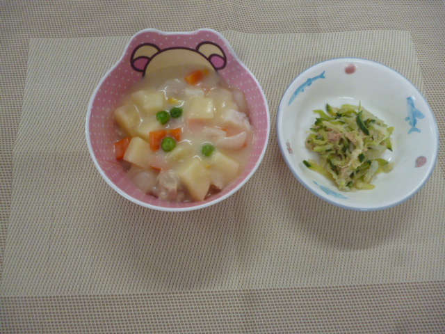 今日の給食は、「コーンシチュー」と「ツナサラダ」