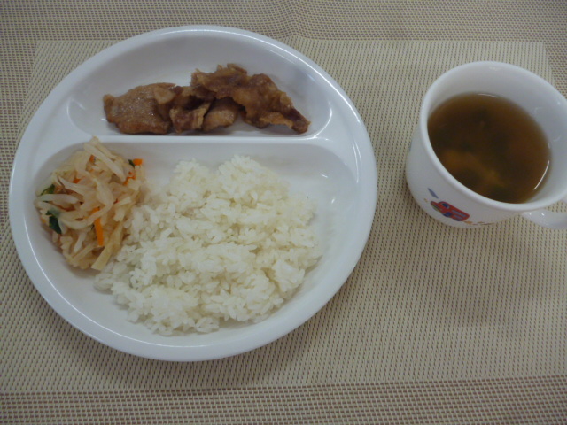 今日の給食は、「豚肉の南蛮漬け」、「もやしのお浸し」と「きのこスープ」 おやつは、「牛乳」、「オレンジ」と「アスパラガスビスケット」です。