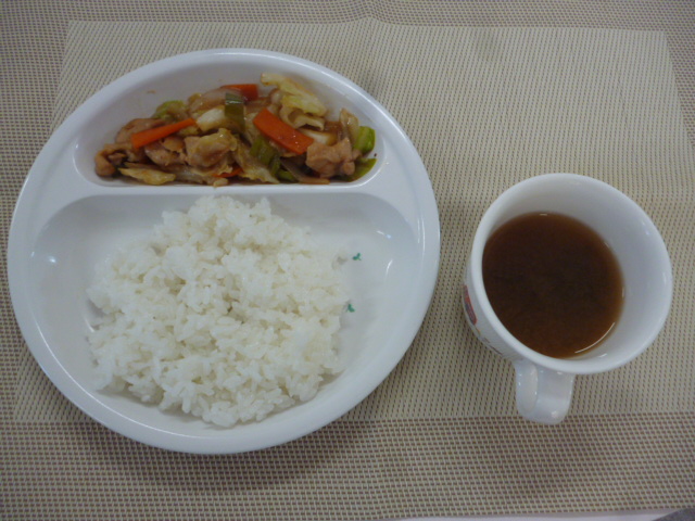 今日の給食は、「鶏肉と野菜の味噌炒め」と「わかめと玉ねぎのすまし汁」 おやつは、「牛乳」と「お楽しみおやつ」です。