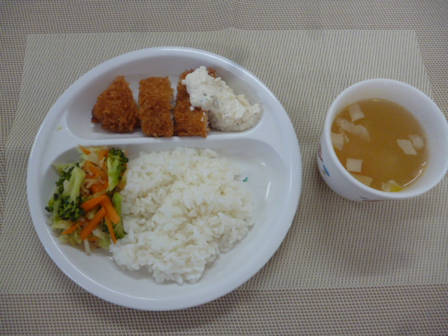 令和3年10月5日(火)の献立 2021/10/05 今日はお誕生日会です🍰 10月生まれのお友達、お誕生日おめでとう✨ 今日の給食は、「白身魚フライ(付)豆腐のタルタルソース」、「蒸し野菜のサラダ」と「かぶのスープ」 おやつは、「牛乳」、「バナナケーキ」と「動物ビスケット」です。