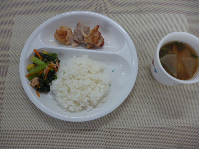 今日の給食は、「鶏肉の照り焼き」、「小松菜とツナの和え物」と「さつま汁」 おやつは、「牛乳」、「マシュマロおこし」と「こんぶ」です。