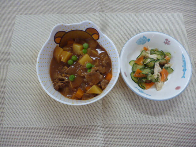 今日の給食は、「カレーライス」と「きゅうりとささみの中華サラダ」 おやつは、「牛乳」と「ホットドッグ」です。