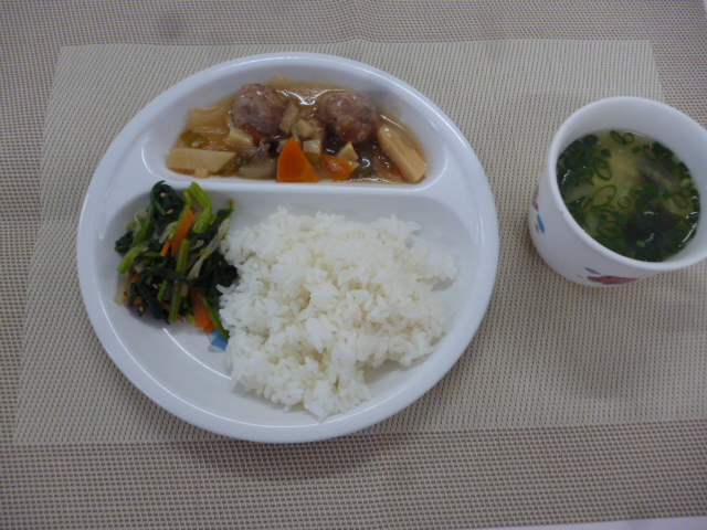 今日の給食は、「肉団子の酢豚風」、「ほうれん草のナムル」と「中華風コーンスープ」