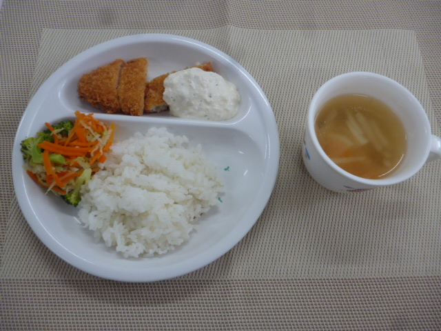 令和3年10月19日(火)の献立 2021/10/19 今日の給食は、「白身魚フライ(付)豆腐のタルタルソース」、「蒸し野菜のサラダ」と「かぶのスープ」 おやつは、「牛乳」、「さつまいももち」と「ぽりぽり小魚」です。
