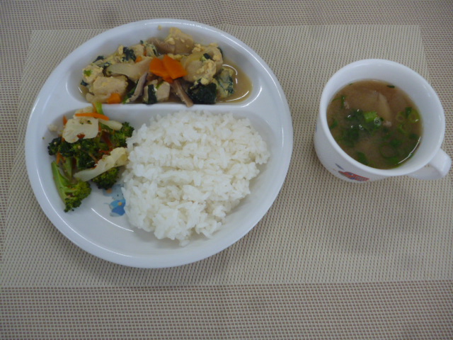 今日の給食は、「高野豆腐のふわふわ煮」、「花野菜のごま酢和え」と「豚汁」