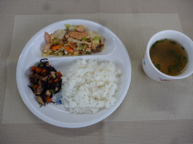 今日の給食は、「鮭のちゃんちゃん焼き」、「大豆とひじきの炒め煮」と「豆腐のすまし汁」 おやつは、「牛乳」、「マシュマロサンド」と「こんぶ」です。